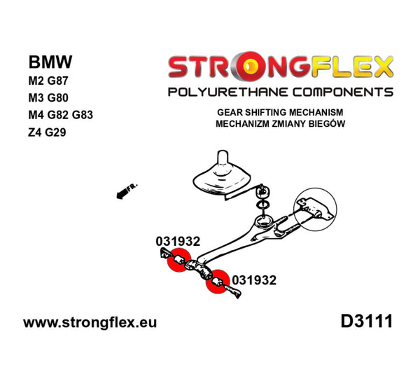 Brazo de cambio - casquillo delantero (ovalado) 19 mm SPORT de Strongflex en poliuretano 90 ShA. Sustituye los silentblocks OEM por versiones reforzadas para ganar precisión, estabilidad y durabilidad en tu BMW E36.