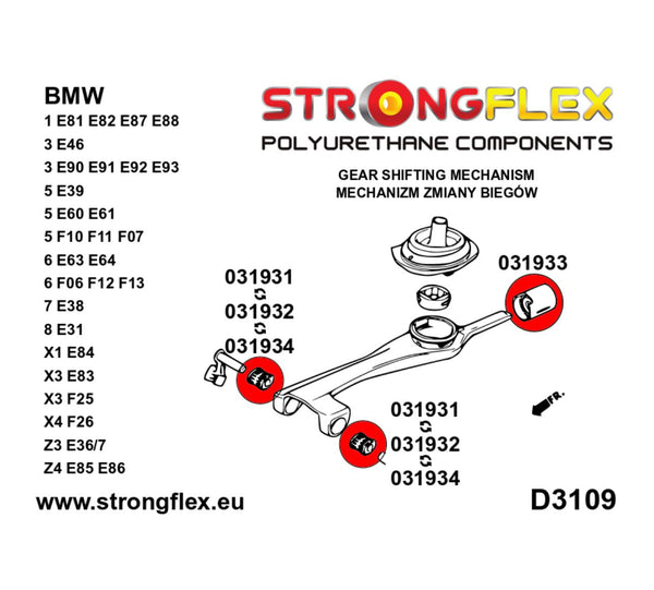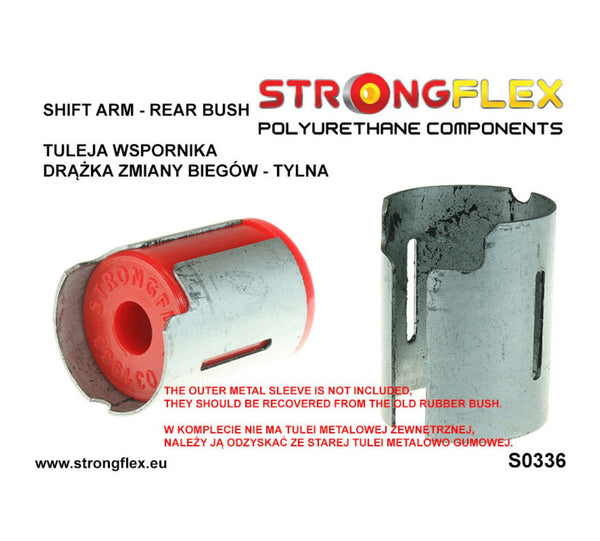 Brazo de cambio - casquillo trasero SPORT de Strongflex en poliuretano 90 ShA. Sustituye los silentblocks OEM por versiones reforzadas para ganar precisión, estabilidad y durabilidad en tu BMW E36.
