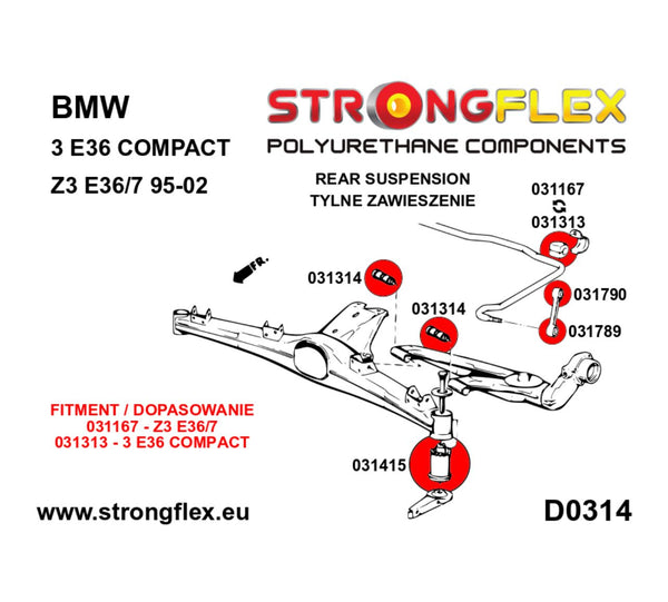 Casquillo de barra estabilizadora delantera/trasera SPORT de Strongflex en poliuretano 90 ShA. Sustituye los silentblocks OEM por versiones reforzadas para ganar precisión, estabilidad y durabilidad en tu BMW E36.